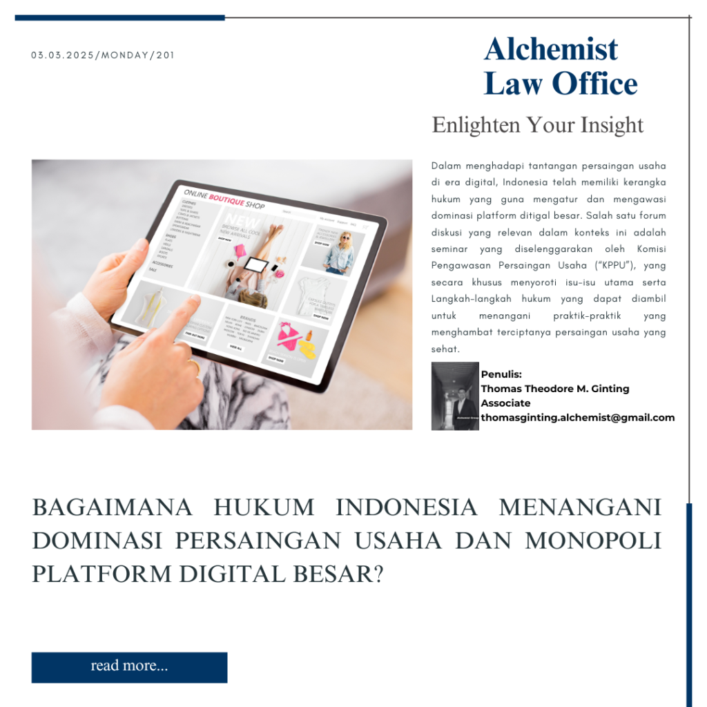 Dalam menghadapi tantangan persaingan usaha di era digital, Indonesia telah memiliki kerangka hukum yang guna mengatur dan mengawasi dominasi platform ditigal besar. Salah satu forum diskusi yang relevan dalam konteks ini adalah seminar yang diselenggarakan oleh Komisi Pengawasan Persaingan Usaha (“KPPU”), yang secara khusus menyoroti isu-isu utama serta Langkah-langkah hukum yang dapat diambil untuk menangani […]
